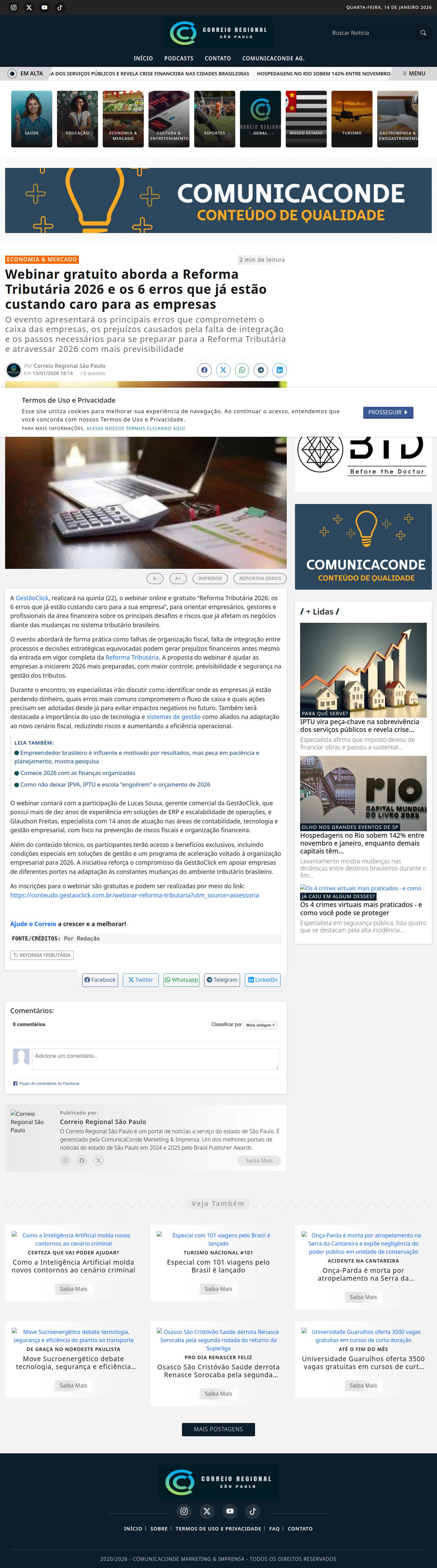Webinar gratuito aborda a Reforma Tributária 2026 e os 6 erros que já estão custando caro para as empresas - Correio Regional São Paulo